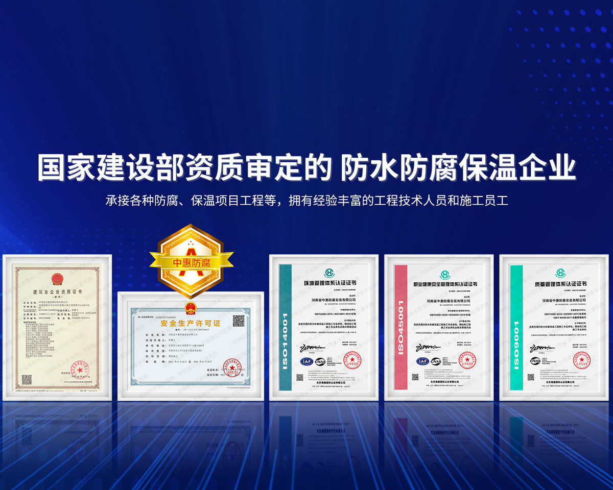 公司經營范圍:防水防腐保溫工程;消防設施工程;建筑裝修裝飾工程;建筑機電安裝工程;電力工程;建筑工程;石油化工工程;工業清洗工程;油罐清洗工程;鋼結構工程;環保工程;模板腳手架工程;電纜防火封堵、防污閃噴涂、外墻外保溫工程;各類施工勞務作業;設備維修、船舶鉚焊、涂裝;電力工程材料、建材、防水材料、防火材料、防腐保溫材料銷售,并相繼通過了GB/T19001-2008idtISO9001:2008GB/T50430-2007質量管理體系認證證書。GB/T24001-2004idtISO14001:2004環境管理體系認證證書。GB/T28001-2011idtOHSAS18001:2007職業健康安全管理體系認證證書。公司是中國防腐蝕于防護協會、中國施工企業管理協會、電力協會和中國鋼結構防水協會會員單位。 公司的經營業務涵蓋了石油、化工、電力、冶金、煤炭、船舶、國防、燃氣、水利、環保、交通運輸、航空及國防軍工和輕紡市政等行業的防腐保溫絕熱設備。鋼結構安裝、防火、防水、金屬噴鍍、聚脲噴繪、陰極保護、防滲透堵漏、玻璃鋼及各種磚版材料襯里、橡膠襯里、煙氣硫和耐酸溶劑腐蝕等工程施工。公司連續十年榮獲“省市先進施工企業”“安全生產先進單位”“重合同,守信用企業”和“AA***資質企業”的稱號。2000年被命名為市級文明單位,2002年被國家工商行政管理局命名為“重合同,守信用的企業”、被中國工業防腐蝕技術協會命名為“防腐蝕企業,能源節約及環境保護領域有豐富的經驗和***的業績。工程一次交驗合格率100%。其中攀枝花鋼鐵公司煉鐵廠四號高爐及熱風爐防腐工程、上海寶鋼公司煤氣柜防腐工程、撫順石油一廠裝置防腐項目、齊魯石化公司稀烴廠高塔防腐工程、吉林化學工業公司煉油廠油罐防腐工程、天津石化熱電廠六號爐頂棚聯絡管保溫工程、大慶油田(太倉)力神泵業工程、中國化學工程第十一建設工程、中原油田勘探局工程、中國石化銷售有限公司華北分部、魯皖輸油管道工程、貴州開磷息烽合成氨工程、陜西黃陵煤化工程、中國石油天然氣西部管道塔里木輸油工程、邯鋼集團邯寶鋼鐵公司煉鐵工程、德州供電工程、吉寶(南通)船廠工程,偃師華潤熱力工程、鄭州熱力總公司。 河南省中惠防腐安裝有限公司愿以豐富的施工經驗,***的技術,***的設備,***的管理,***的服務,竭誠為國內外廣大的用戶提供***滿意、******的工程作品。 我公司愿與國內外同仁一道,團結協作,共同推進防腐蝕行業發展! 公司地址:河南省長垣縣建設路北段360號 固定電話:0373-8866488 郵編:453400 網址:http://www_zhff_com_cn.csrcindia.com